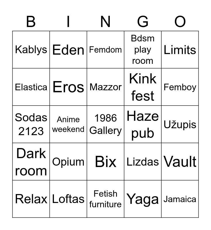This bingo card has a free space and 24 words: Opium, Loftas, Mazzor, Relax, Limits, Kablys, Elastica, Eden, Haze pub, Bix, Kink fest, Sodas 2123, Lizdas, Vault, Eros, Yaga, Užupis, Femdom, Femboy, Anime weekend, Jamaica, Dark room, Bdsm play room and Fetish furniture.