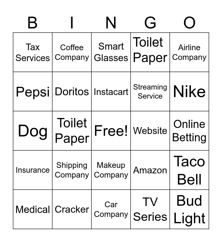 This bingo card has a free space and 52 words: Coke, Bud Light, Baby, Car Company, Shipping Company, Candy, Coffee Company, Movie Trailer, Pepsi, Mountain Dew, Doritos, Truck Company, Taco Bell, Amazon, Loans Banking, Michelob, Instacart, Website, Cruise, Airline Company, Toilet Paper, TV Series, Tax Services, Streaming Service, Restaurant, Soap Shampoo, Phone Company, Food Delivery, Nike, Chip Company, Energy Drink, Toilet Paper, Budweiser, Battery, Google, Smart Glasses, Cracker, Cable Company, NFL, Cell Phone Brand, Shoe Company, Online Betting, Insurance, Ice Cream, Makeup Company, Horse, Cat, Dog, Laundry Detergent, Credit Card, Medical and Pop.