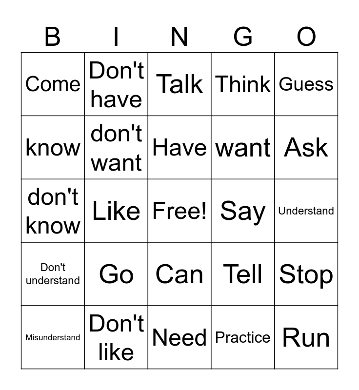 This bingo card has a free space and 24 words: Go, Don't like, Have, Misunderstand, Guess, Come, know, Don't have, Say, Can, want, don't know, Tell, Stop, don't want, Practice, Understand, Talk, Ask, Like, Run, Don't understand, Think and Need.