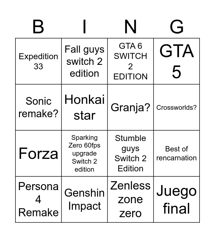This bingo card has 16 words: Genshin Impact, Best of rencarnation, GTA 6 SWITCH 2 EDITION, Expedition 33, Forza, Fall guys switch 2 edition, Stumble guys Switch 2 Edition, Zenless zone zero, Sonic remake?, Honkai star, Persona 4 Remake, GTA 5, Sparking Zero 60fps upgrade Switch 2 edition, Crossworlds?, Granja? and Juego final.