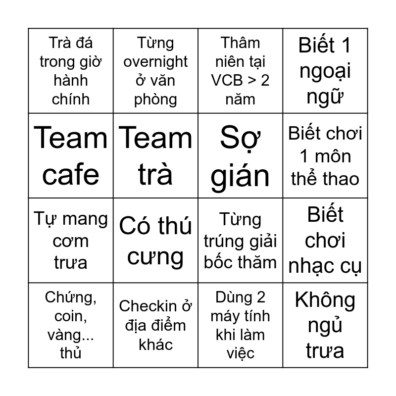 This bingo card has 16 words: Checkin ở địa điểm khác, Biết chơi nhạc cụ, Thâm niên tại VCB > 2 năm, Trà đá trong giờ hành chính, Tự mang cơm trưa, Từng overnight ở văn phòng, Từng trúng giải bốc thăm, Dùng 2 máy tính khi làm việc, Team cafe, Team trà, Chứng, coin, vàng... thủ, Biết 1 ngoại ngữ, Có thú cưng, Biết chơi 1 môn thể thao, Sợ gián and Không ngủ trưa.