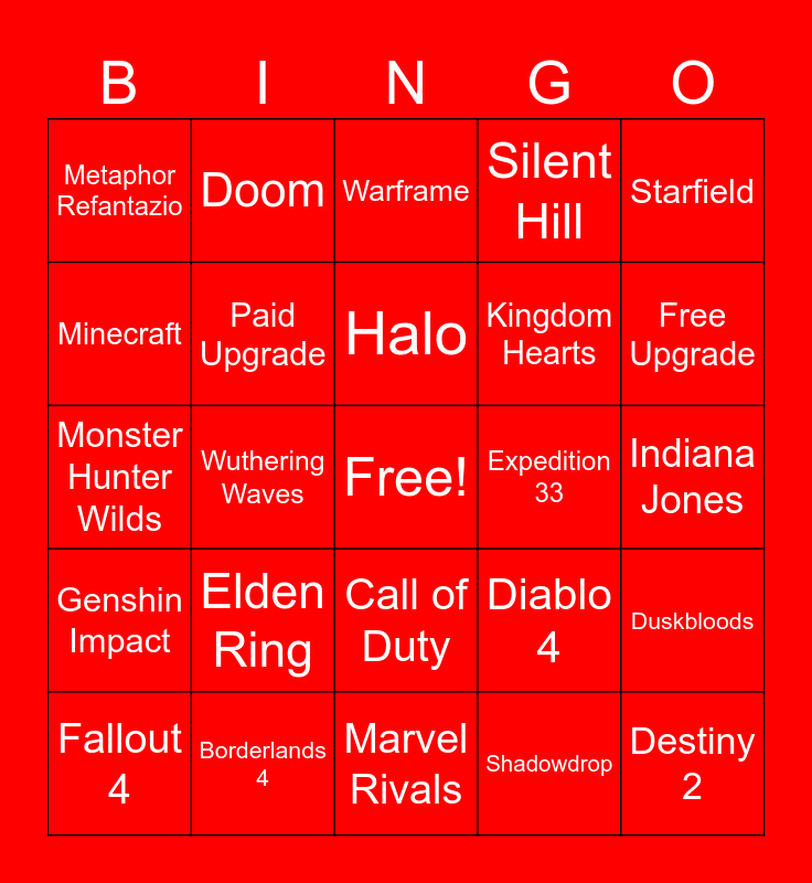 This bingo card has a free space and 24 words: Elden Ring, Borderlands 4, Halo, Fallout 4, Starfield, Metaphor Refantazio, Minecraft, Doom, Expedition 33, Call of Duty, Kingdom Hearts, Monster Hunter Wilds, Diablo 4, Duskbloods, Paid Upgrade, Shadowdrop, Indiana Jones, Warframe, Free Upgrade, Wuthering Waves, Destiny 2, Genshin Impact, Silent Hill and Marvel Rivals.