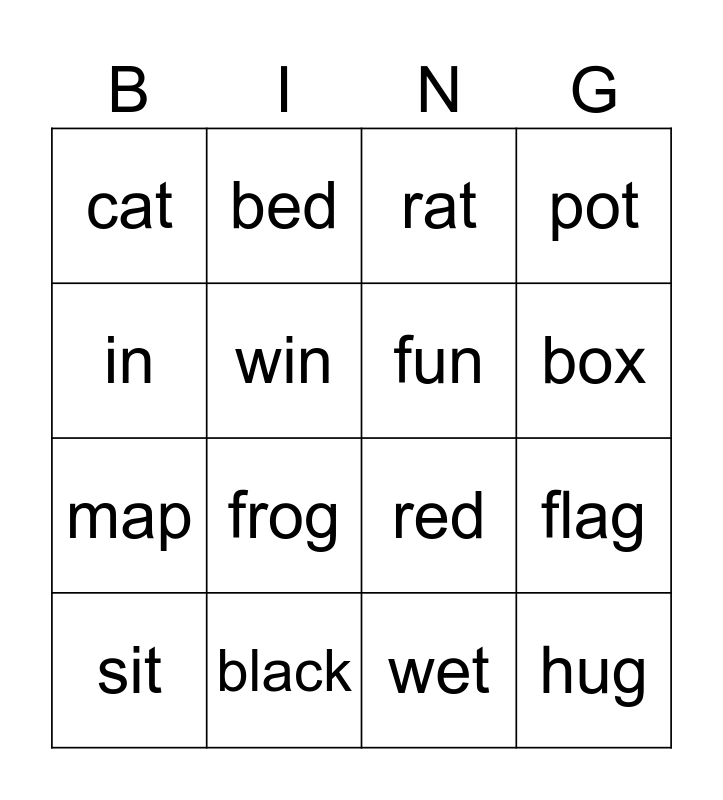 This bingo card has 16 words: black, flag, rat, cat, map, bed, red, wet, in, win, sit, pot, frog, box, fun and hug.