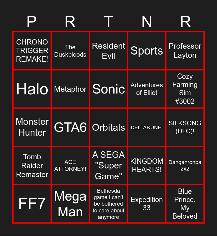 This bingo card has a free space and 24 words: ACE ATTORNEY!, Mega Man, Sonic, FF7, Professor Layton, CHRONO TRIGGER REMAKE!, Halo, The Duskbloods, DELTARUNE!, A SEGA "Super Game", Adventures of Elliot, Monster Hunter, KINGDOM HEARTS!, Danganronpa 2x2, Metaphor, Expedition 33, SILKSONG (DLC)!, Resident Evil, Cozy Farming Sim #3002, GTA6, Blue Prince, My Beloved, Tomb Raider Remaster, Sports and Bethesda game I can't be bothered to care about anymore.