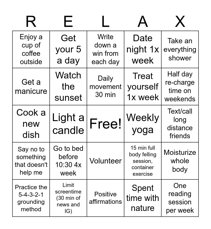This bingo card has a free space and 36 words: Try Mediation 1x week, Stretch in mornings or evenings, Ask for help, Watch the sunset, 15 min full body felling session, container exercise, Say no to something that doesn't help me, Daily movement 30 min, Write a gratitude list each week, Take an everything shower, 4-5 homecooked meals per week, Light a candle, Date night 1x week, Quick 10 min cleanup, Weekly yoga, Half day re-charge time on weekends, Enjoy a cup of coffee outside, See friends 1x week, Go to bed before 10:30 4x week, One reading session per week, Write down a win from each day, Text/call long distance friends, Moisturize whole body, Limit screentime (30 min of news and IG), Practice the 5-4-3-2-1 grounding method, Positive affirmations, Get your 5 a day, Cook a new dish, Do a face mask, Treat yourself 1x week, Get a manicure, Write down 3 goals, Speak highly of yourself, Spent time with nature, Volunteer, Did something creative and Complete a task you've been putting off.