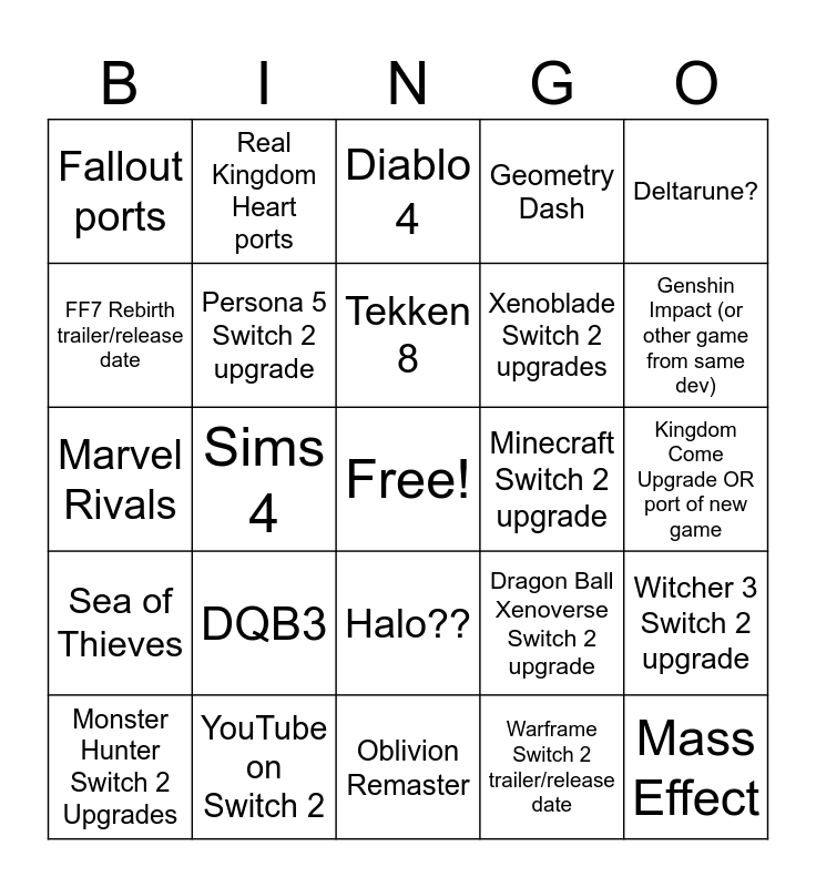 This bingo card has a free space and 24 words: DQB3, YouTube on Switch 2, Tekken 8, Monster Hunter Switch 2 Upgrades, Deltarune?, Fallout ports, FF7 Rebirth trailer/release date, Real Kingdom Heart ports, Minecraft Switch 2 upgrade, Halo??, Xenoblade Switch 2 upgrades, Marvel Rivals, Dragon Ball Xenoverse Switch 2 upgrade, Witcher 3 Switch 2 upgrade, Persona 5 Switch 2 upgrade, Warframe Switch 2 trailer/release date, Kingdom Come Upgrade OR port of new game, Diablo 4, Genshin Impact (or other game from same dev), Sims 4, Mass Effect, Sea of Thieves, Geometry Dash and Oblivion Remaster.