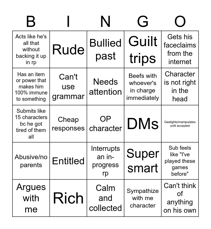 This bingo card has a free space and 24 words: Entitled, Rich, Needs attention, Argues with me, Gets his faceclaims from the internet, Acts like he's all that without backing it up in rp, Has an item or power that makes him 100% immune to something, Rude, DMs, Interrupts an in-progress rp, Beefs with whoever's in charge immediately, Submits like 15 characters bc he got tired of them all, Super smart, Sub feels like "I've played these games before", Can't use grammar, Sympathize with me character, Gaslights/manipulates until accepted, Bullied past, Character is not right in the head, Cheap responses, Can't think of anything on his own, Abusive/no parents, Guilt trips and Calm and collected.