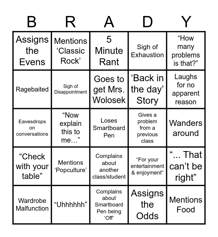 This bingo card has 48 words: Drinks from Waterbottle, Loses Smartboard Pen, Unreadable Penmanship, Complains about Smartboard Pen being ‘Off’, Mentions ‘Popculture’, Mentions ‘Sci-Fi’, Mentions ‘Classic Rock’, “I don’t know, can you?”, Ragebaited, Crashout, Sigh of Disappointment, Sigh of Exhaustion, “... That can’t be right”, “For your entertainment & enjoyment”, Bathroom Break, Leaves the room for no apparent reason, Goes to get Mrs. Wolosek, Gives a problem from a previous class, Spelling Error, “How many problems is that?”, “Now explain this to me…”, Assigns the Odds, Assigns the Evens, ‘Back in the day’ Story, Story about a student’s family member, Laughs for no apparent reason, Wardrobe Malfunction, Technology Malfunction, Complains about another class/student, “Check with your table”, “Bring it here”, “You laugh now but…”, “I told you so”, “Fine we’ll do it that way”, “Uhhhhhh”, Calls the book/program stupid, Doesn’t explain steps, Wanders around, Trivia questions, Riddles/ Trick questions, Mentions Mathleague, Mentions Food, 5 Minute Rant, Mentions a political topic, Eavesdrops on conversations, Oblivious to Shenanigans, Forgot something he said and Mentions old age.