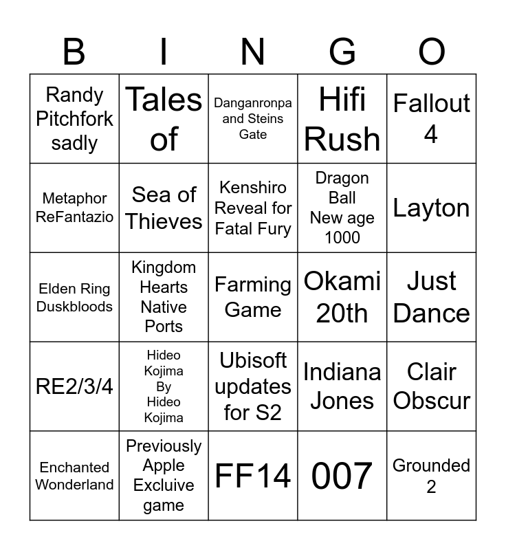 This bingo card has a free space and 24 words: Hideo Kojima By Hideo Kojima, Previously Apple Excluive game, Kenshiro Reveal for Fatal Fury, Enchanted Wonderland, Fallout 4, Randy Pitchfork sadly, Metaphor ReFantazio, Tales of, Okami 20th, Ubisoft updates for S2, Dragon Ball New age 1000, Elden Ring Duskbloods, Indiana Jones, Clair Obscur, Sea of Thieves, 007, Just Dance, Danganronpa and Steins Gate, Layton, Kingdom Hearts Native Ports, Grounded 2, RE2/3/4, Hifi Rush and FF14.