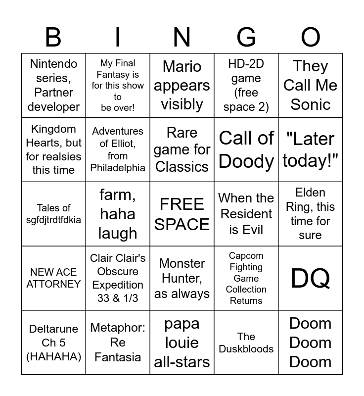 This bingo card has a free space and 24 words: Clair Clair's Obscure Expedition 33 & 1/3, Metaphor: Re Fantasia, Rare game for Classics, Deltarune Ch 5 (HAHAHA), They Call Me Sonic, Nintendo series, Partner developer, Kingdom Hearts, but for realsies this time, My Final Fantasy is for this show to be over!, When the Resident is Evil, Monster Hunter, as always, Call of Doody, Tales of sgfdjtrdtfdkia, Capcom Fighting Game Collection Returns, DQ, Adventures of Elliot, from Philadelphia, The Duskbloods, Elden Ring, this time for sure, Mario appears visibly, "Later today!", farm, haha laugh, Doom Doom Doom, NEW ACE ATTORNEY, HD-2D game (free space 2) and papa louie all-stars.