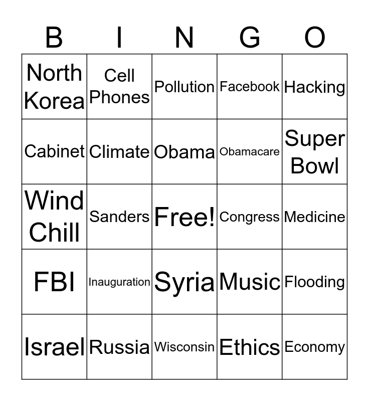 This bingo card has a free space and 40 words: Winter, Wind Chill, Trump, Climate, Russia, Syria, Obama, Clinton, Hacking, FBI, Sanders, Facebook, Economy, Medicine, Congress, Inauguration, War, North Korea, China, Pollution, Flooding, Ethics, Obamacare, Cabinet, Zoo, Dogs, Cats, Computers, DAPL, Earthquake, Twitter, Israel, Education, Music, Super Bowl, Wisconsin, California, Florida, Cell Phones and Martin Luther King.