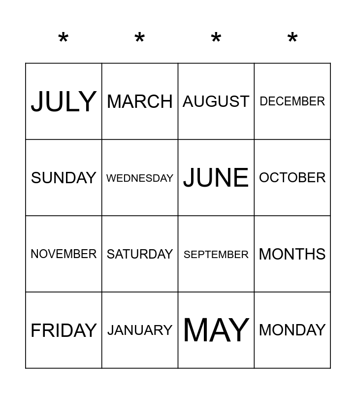 This bingo card has 21 words: JANUARY, FEBRUARY, MARCH, APRIL, MAY, JUNE, JULY, AUGUST, SEPTEMBER, OCTOBER, NOVEMBER, DECEMBER, MONDAY, TUESDAY, WEDNESDAY, THURSDAY, FRIDAY, SATURDAY, SUNDAY, MONTHS and DAYS.