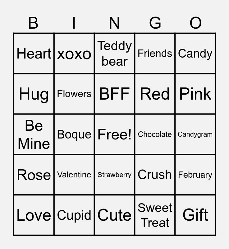 This bingo card has a free space and 24 words: Valentine, Cupid, BFF, Love, Candy, Heart, Hug, xoxo, Chocolate, Strawberry, Red, Be Mine, Crush, February, Flowers, Sweet Treat, Candygram, Teddy bear, Pink, Boque, Gift, Rose, Friends and Cute.