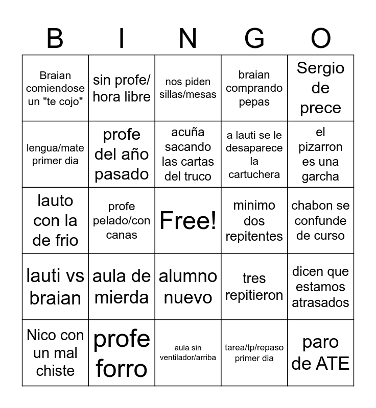 This bingo card has a free space and 24 words: aula de mierda, profe forro, acuña sacando las cartas del truco, Nico con un mal chiste, Sergio de prece, Braian comiendose un "te cojo", lengua/mate primer dia, sin profe/ hora libre, minimo dos repitentes, alumno nuevo, a lauti se le desaparece la cartuchera, lauto con la de frio, tres repitieron, dicen que estamos atrasados, profe del año pasado, tarea/tp/repaso primer dia, chabon se confunde de curso, nos piden sillas/mesas, el pizarron es una garcha, profe pelado/con canas, paro de ATE, lauti vs braian, braian comprando pepas and aula sin ventilador/arriba.