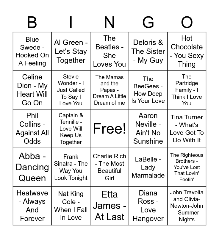 This bingo card has a free space and 24 words: Frank Sinatra - The Way You Look Tonight, Nat King Cole - When I Fall In Love, The Mamas and the Papas - Dream A Little Dream of me, Heatwave - Always And Forever, Hot Chocolate - You Sexy Thing, Blue Swede - Hooked On A Feeling, Celine Dion - My Heart Will Go On, Al Green - Let's Stay Together, Aaron Neville - Ain't No Sunshine, Charlie Rich - The Most Beautiful Girl, The BeeGees - How Deep Is Your Love, Phil Collins - Against All Odds, LaBelle - Lady Marmalade, The Righteous Brothers - You've Lost That Lovin' Feelin', Stevie Wonder - I Just Called To Say I Love You, Diana Ross - Love Hangover, Tina Turner - What's Love Got To Do With It, The Beatles - She Loves You, The Partridge Family - I Think I Love You, Captain & Tennille - Love Will Keep Us Together, John Travolta and Olivia-Newton-John - Summer Nights, Abba - Dancing Queen, Deloris & The Sister - My Guy and Etta James - At Last.