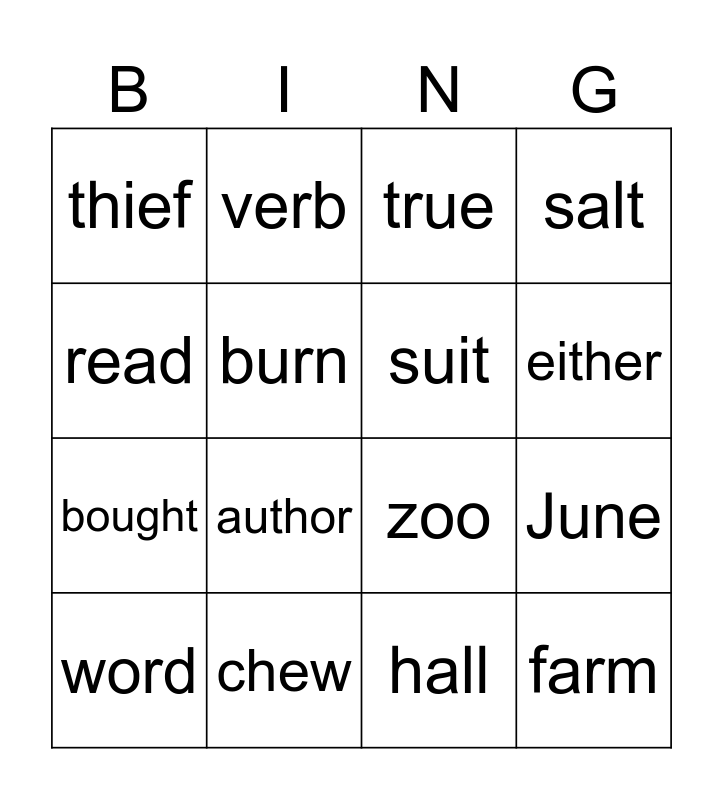 This bingo card has 23 words: farm, tomato, either, feet, read, thief, burn, verb, word, abroad, author, bought, straw, warm, chew, movie, true, zoo, suit, June, salt, hall and you.
