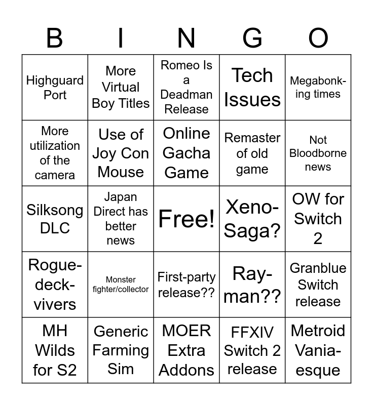 This bingo card has a free space and 24 words: Monster fighter/collector, Generic Farming Sim, Online Gacha Game, MH Wilds for S2, Megabonk-ing times, Highguard Port, More utilization of the camera, More Virtual Boy Titles, Xeno-Saga?, First-party release??, Remaster of old game, Silksong DLC, Ray-man??, Granblue Switch release, Use of Joy Con Mouse, FFXIV Switch 2 release, OW for Switch 2, Romeo Is a Deadman Release, Not Bloodborne news, Japan Direct has better news, Metroid Vania-esque, Rogue-deck-vivers, Tech Issues and MOER Extra Addons.