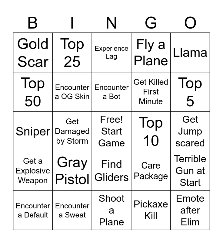 This bingo card has a free space and 24 words: Gray Pistol, Encounter a Sweat, Encounter a Bot, Encounter a Default, Llama, Gold Scar, Top 50, Top 25, Top 10, Find Gliders, Get Killed First Minute, Sniper, Care Package, Terrible Gun at Start, Encounter a OG Skin, Pickaxe Kill, Get Jump scared, Experience Lag, Top 5, Get Damaged by Storm, Emote after Elim, Get a Explosive Weapon, Fly a Plane and Shoot a Plane.