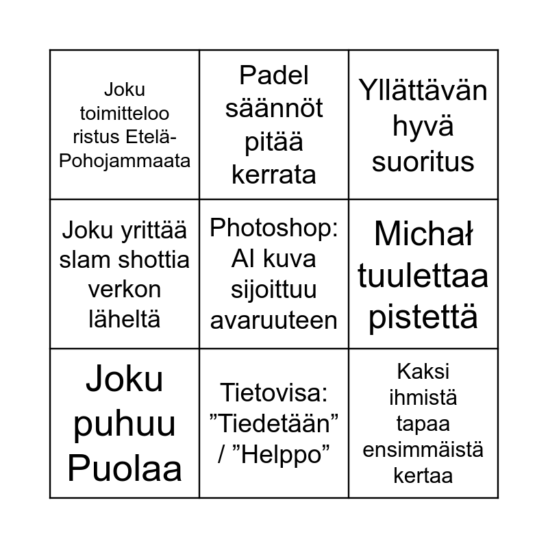 This bingo card has 9 words: Joku puhuu Puolaa, Yllättävän hyvä suoritus, Padel säännöt pitää kerrata, Joku yrittää slam shottia verkon läheltä, Joku toimitteloo ristus Etelä-Pohojammaata, Michał tuulettaa pistettä, Photoshop: AI kuva sijoittuu avaruuteen, Kaksi ihmistä tapaa ensimmäistä kertaa and Tietovisa: ”Tiedetään” / ”Helppo”.