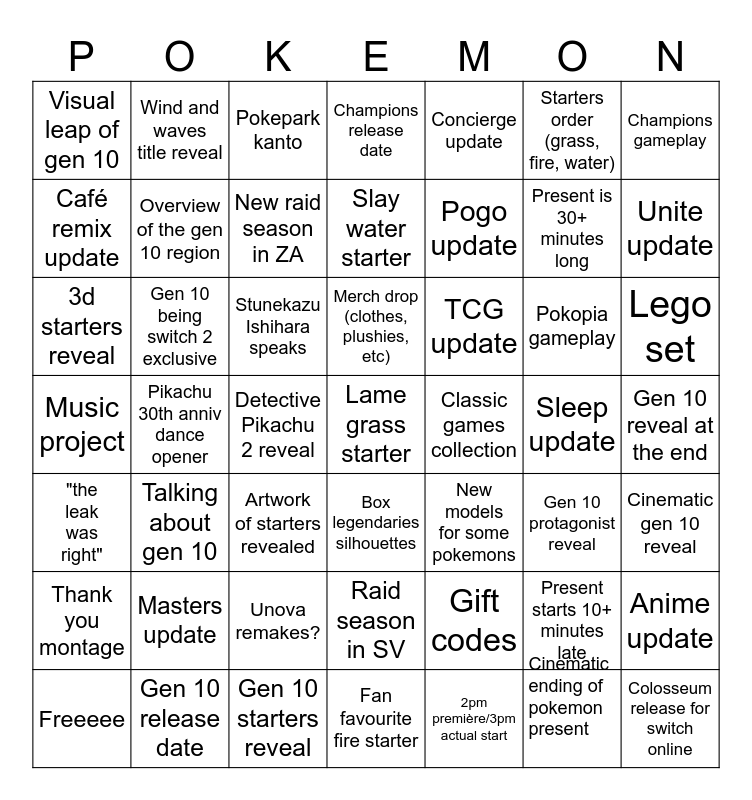 This bingo card has 49 words: Present starts 10+ minutes late, Present is 30+ minutes long, 2pm première/3pm actual start, Pikachu 30th anniv dance opener, Stunekazu Ishihara speaks, Gen 10 reveal at the end, Wind and waves title reveal, Gen 10 starters reveal, Starters order (grass, fire, water), Box legendaries silhouettes, Champions gameplay, Champions release date, Pokopia gameplay, TCG update, Masters update, Sleep update, Café remix update, Unite update, Anime update, Concierge update, Pogo update, Detective Pikachu 2 reveal, Visual leap of gen 10, Overview of the gen 10 region, Freeeee, New raid season in ZA, Lego set, Gen 10 release date, Merch drop (clothes, plushies, etc), Gen 10 being switch 2 exclusive, Colosseum release for switch online, Classic games collection, Thank you montage, Unova remakes?, Music project, New models for some pokemons, Gen 10 protagonist reveal, Cinematic gen 10 reveal, 3d starters reveal, Artwork of starters revealed, Raid season in SV, "the leak was right", Lame grass starter, Fan favourite fire starter, Slay water starter, Pokepark kanto, Gift codes, Talking about gen 10 and Cinematic ending of pokemon present.