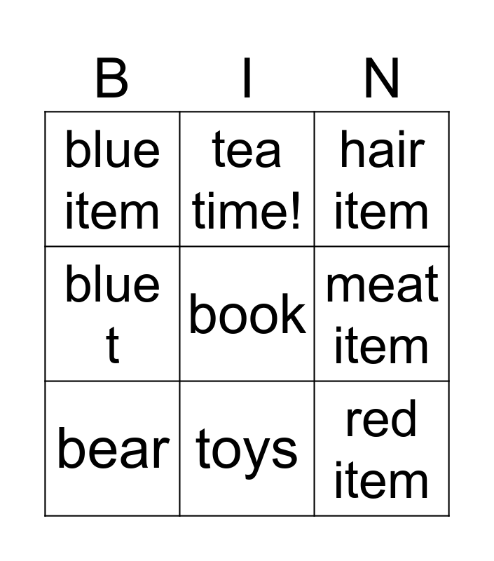 This bingo card has a free space and 12 words: baby bear, dairy item, red item, meat item, tea time!, hair item, toys, animal, blue item, blue t, bear and animal.