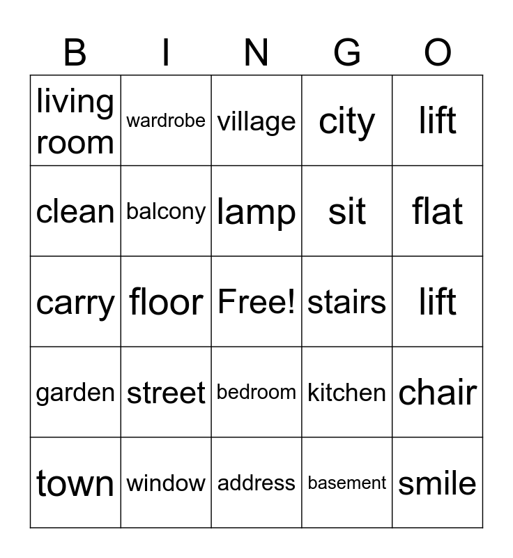 This bingo card has a free space and 24 words: street, window, lamp, town, lift, living room, clean, wardrobe, stairs, bedroom, sit, carry, kitchen, chair, balcony, basement, lift, village, flat, floor, smile, garden, city and address.