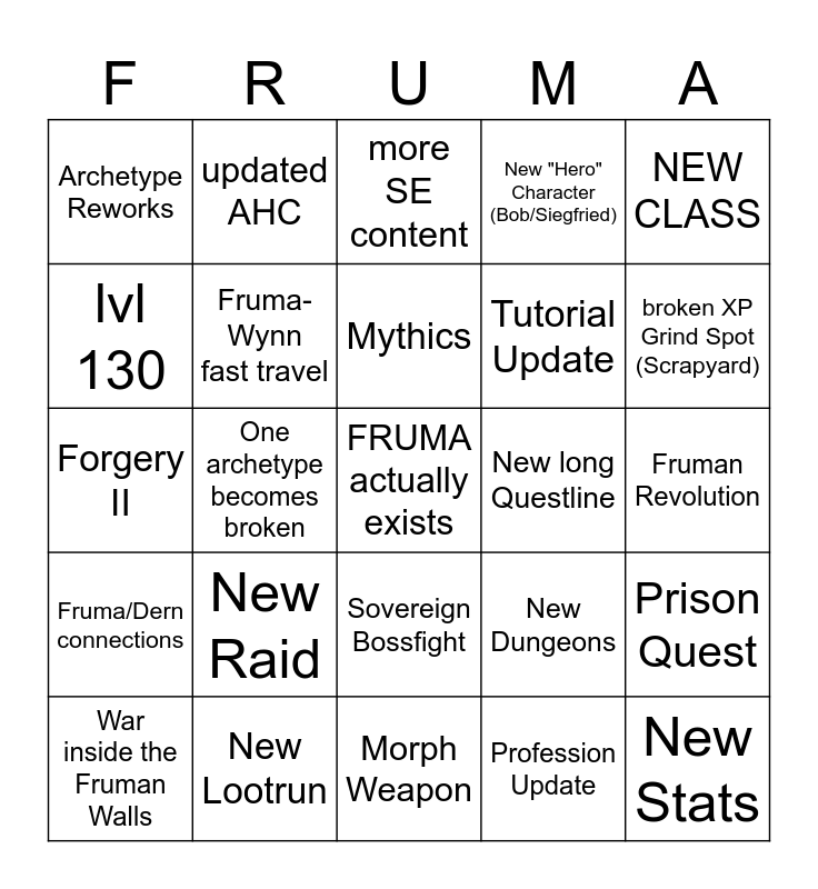 This bingo card has a free space and 24 words: New Raid, New Lootrun, Mythics, War inside the Fruman Walls, NEW CLASS, Archetype Reworks, lvl 130, updated AHC, New long Questline, Sovereign Bossfight, Tutorial Update, Forgery II, New Dungeons, Prison Quest, Fruma-Wynn fast travel, Profession Update, Fruman Revolution, more SE content, broken XP Grind Spot (Scrapyard), One archetype becomes broken, New Stats, Fruma/Dern connections, New "Hero" Character (Bob/Siegfried) and Morph Weapon.