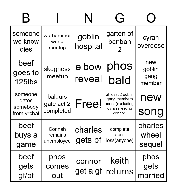 This bingo card has a free space and 24 words: Connah remains unemployed, phos comes out, elbow reveal, beef gets gf/bf, cyran overdose, someone we know dies, beef goes to 125lbs, warhammer world meetup, at least 2 goblin gang members meet (excluding cyran meeting connor), charles gets bf, phos bald, someone dates somebody from vrchat, complete aura loss(anyone), charles wheel sequel, skegness meetup, keith returns, new song, goblin hospital, new goblin gang member, baldurs gate act 2 completed, phos gets married, beef buys a game, garten of banban 2 and connor get a gf.