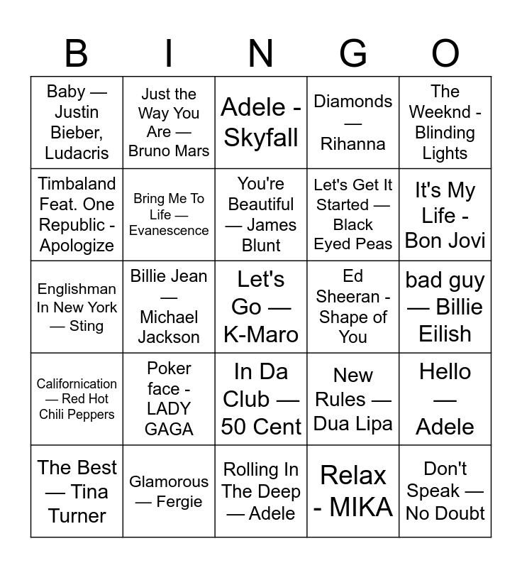 This bingo card has 29 words: The Best — Tina Turner, Queen - Show must go on, Billie Jean — Michael Jackson, Don't Speak — No Doubt, Baby — Justin Bieber, Ludacris, Adele - Skyfall, Bring Me To Life — Evanescence, Poker face -LADY GAGA, Ed Sheeran - Shape of You, Glamorous — Fergie, bad guy — Billie Eilish, Let's Go — K-Maro, Rolling In The Deep — Adele, Relax - MIKA, It's My Life - Bon Jovi, Summertime Sadness — Lana Del Rey, In Da Club — 50 Cent, Californication — Red Hot Chili Peppers, The Weeknd - Blinding Lights, Englishman In New York — Sting, New Rules — Dua Lipa, Lady — Modjo, Let's Get It Started — Black Eyed Peas, Timbaland Feat. One Republic - Apologize, Diamonds — Rihanna, Just the Way You Are — Bruno Mars, Hello — Adele, You're Beautiful — James Blunt and Oh, Pretty Woman — Roy Orbison.