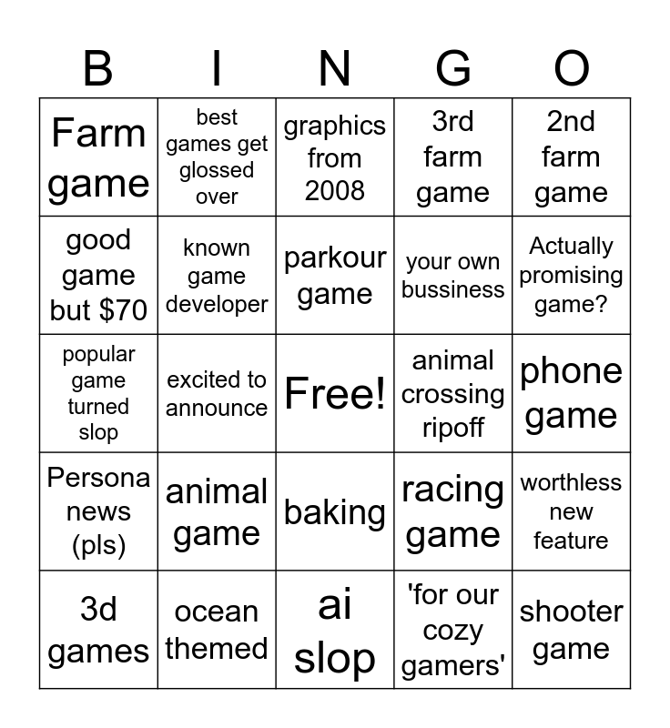 This bingo card has a free space and 24 words: animal game, ocean themed, parkour game, 3d games, 2nd farm game, Farm game, good game but $70, best games get glossed over, animal crossing ripoff, baking, your own bussiness, popular game turned slop, racing game, worthless new feature, known game developer, 'for our cozy gamers', phone game, graphics from 2008, Actually promising game?, excited to announce, shooter game, Persona news (pls), 3rd farm game and ai slop.