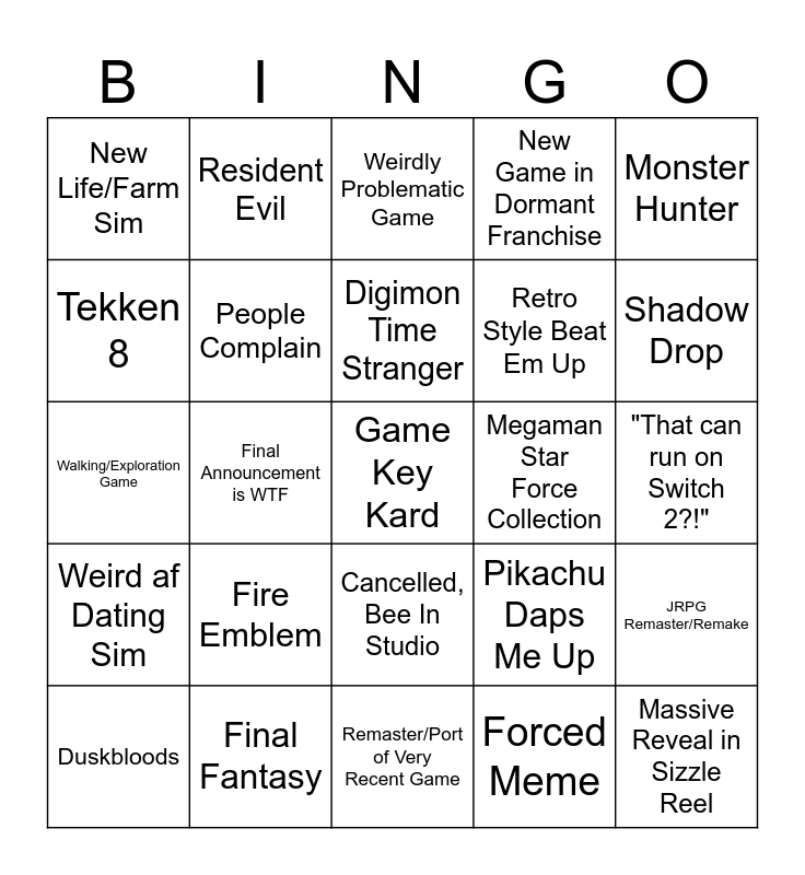 This bingo card has a free space and 24 words: Fire Emblem, Final Fantasy, Digimon Time Stranger, Duskbloods, Monster Hunter, New Life/Farm Sim, Tekken 8, Resident Evil, Megaman Star Force Collection, Cancelled, Bee In Studio, Retro Style Beat Em Up, Walking/Exploration Game, Pikachu Daps Me Up, JRPG Remaster/Remake, People Complain, Forced Meme, "That can run on Switch 2?!", Weirdly Problematic Game, Shadow Drop, Final Announcement is WTF, Massive Reveal in Sizzle Reel, Weird af Dating Sim, New Game in Dormant Franchise and Remaster/Port of Very Recent Game.