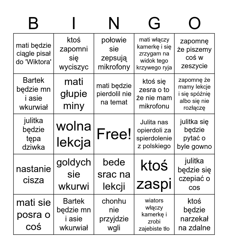 This bingo card has a free space and 24 words: mati sie posra o coś, goldych sie wkurwi, mati będzie pierdolil nie na temat, wiators włączy kamerkę i zrobi zajebiste tło, zapomnę że piszemy coś w zeszycie, mati będzie ciągle pisał do 'Wiktora', ktoś zapomni się wyciszyc, połowie sie zepsują mikrofony, Julita nas opierdoli za spierdolenie z polskiego, julitka się będzie pytać o byle gowno, julitka będzie tępa dziwka, mati głupie miny, ktoś zaspi, julitka będzie się czepiać o cos, Bartek będzie mn i asie wkurwiał, Bartek będzie mn i asie wkurwiał, chonhu nie przyjdzie wgli, mati włączy kamerkę i się zrzygam na widok tego krzywego ryja, zapomnę że mamy lekcje i się spóźnię albo się nie rozłączę, nastanie cisza, wolna lekcja, bede srac na lekcji, ktoś się zesra o to że nie mam mikrofonu and ktoś będzie narzekał na zdalne.