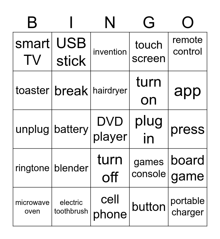 This bingo card has a free space and 24 words: blender, electric toothbrush, hairdryer, microwave oven, remote control, smart TV, toaster, USB stick, plug in, turn off, turn on, unplug, games console, board game, break, button, press, invention, app, battery, portable charger, ringtone, touch screen and cell phone.