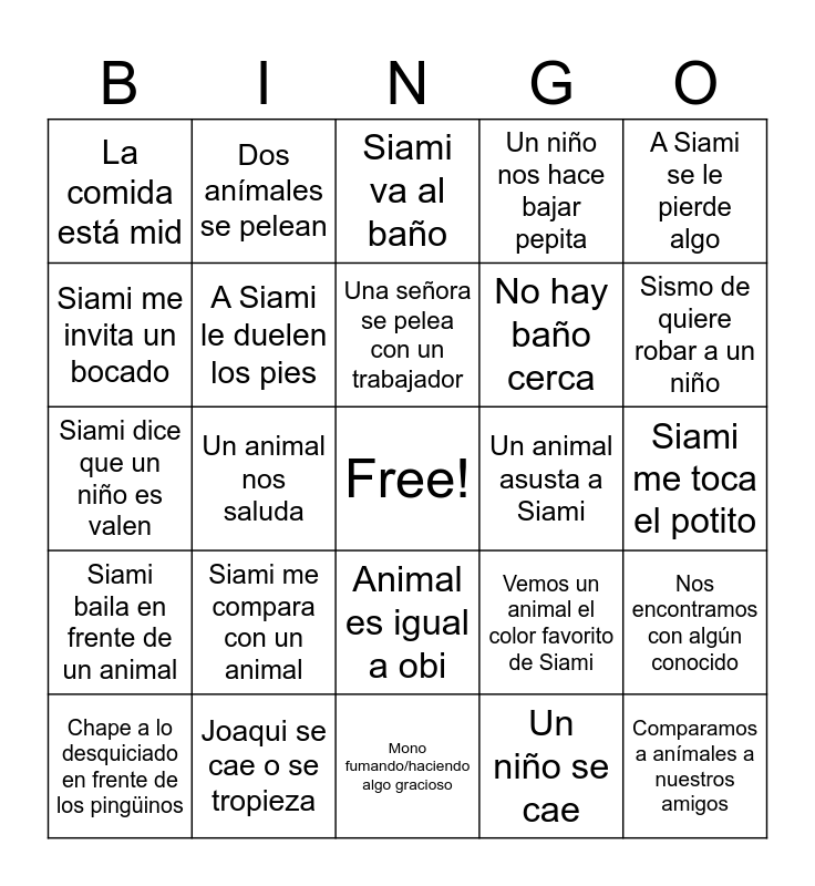 This bingo card has a free space and 24 words: Siami me compara con un animal, Joaqui se cae o se tropieza, Una señora se pelea con un trabajador, Chape a lo desquiciado en frente de los pingüinos, A Siami se le pierde algo, La comida está mid, Siami me invita un bocado, Dos anímales se pelean, Un animal asusta a Siami, Animal es igual a obi, No hay baño cerca, Siami dice que un niño es valen, Vemos un animal el color favorito de Siami, Nos encontramos con algún conocido, A Siami le duelen los pies, Un niño se cae, Siami me toca el potito, Siami va al baño, Sismo de quiere robar a un niño, Un animal nos saluda, Comparamos a anímales a nuestros amigos, Siami baila en frente de un animal, Un niño nos hace bajar pepita and Mono fumando/haciendo algo gracioso.