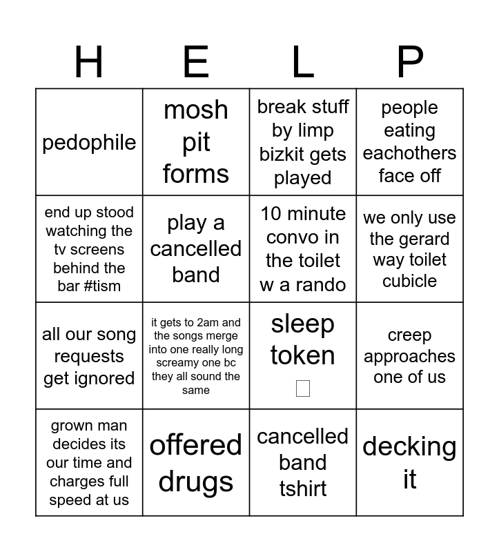 This bingo card has 16 words: offered drugs, creep approaches one of us, break stuff by limp bizkit gets played, pedophile, all our song requests get ignored, mosh pit forms, sleep token 🫩, cancelled band tshirt, end up stood watching the tv screens behind the bar #tism, play a cancelled band, grown man decides its our time and charges full speed at us, people eating eachothers face off, it gets to 2am and the songs merge into one really long screamy one bc they all sound the same, we only use the gerard way toilet cubicle, 10 minute convo in the toilet w a rando and decking it.
