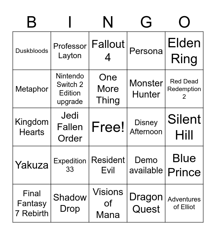 This bingo card has a free space and 24 words: Expedition 33, Shadow Drop, One More Thing, Final Fantasy 7 Rebirth, Elden Ring, Duskbloods, Metaphor, Professor Layton, Disney Afternoon, Resident Evil, Monster Hunter, Kingdom Hearts, Demo available, Blue Prince, Nintendo Switch 2 Edition upgrade, Dragon Quest, Silent Hill, Fallout 4, Red Dead Redemption 2, Jedi Fallen Order, Adventures of Elliot, Yakuza, Persona and Visions of Mana.