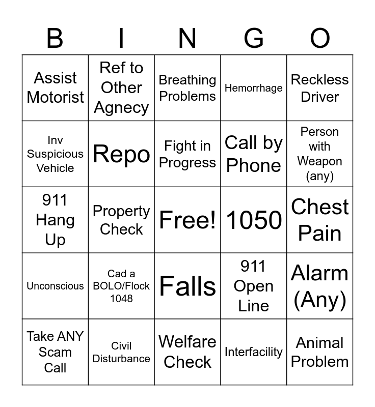This bingo card has a free space and 24 words: Cad a BOLO/Flock 1048, Civil Disturbance, Fight in Progress, Take ANY Scam Call, Reckless Driver, Assist Motorist, Inv Suspicious Vehicle, Ref to Other Agnecy, 1050, Falls, Call by Phone, 911 Hang Up, 911 Open Line, Alarm (Any), Repo, Interfacility, Chest Pain, Breathing Problems, Person with Weapon (any), Property Check, Animal Problem, Unconscious, Hemorrhage and Welfare Check.