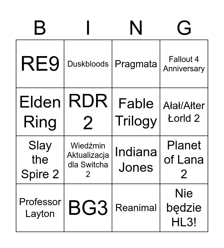 This bingo card has 16 words: BG3, Planet of Lana 2, Pragmata, RE9, Slay the Spire 2, Duskbloods, Indiana Jones, Reanimal, Elden Ring, RDR 2, Professor Layton, Fallout 4 Anniversary, Wiedźmin Aktualizacja dla Switcha 2, Ałał/Ałter Łorld 2, Fable Trilogy and Nie będzie HL3!.