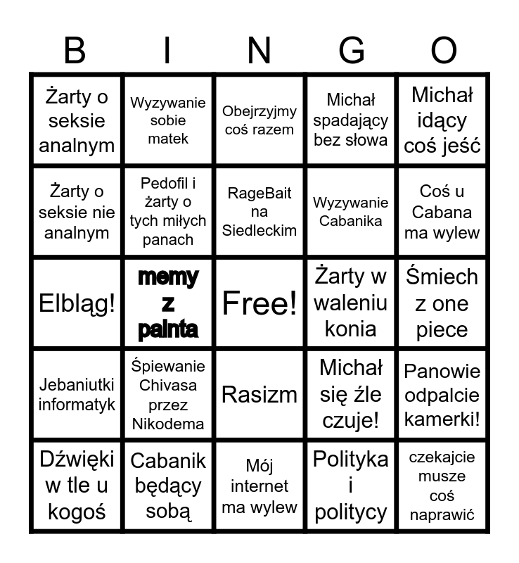 This bingo card has a free space and 24 words: Śpiewanie Chivasa przez Nikodema, Cabanik będący sobą, RageBait na Siedleckim, Dźwięki w tle u kogoś, Michał idący coś jeść, Żarty o seksie analnym, Żarty o seksie nie analnym, Wyzywanie sobie matek, Żarty w waleniu konia, Rasizm, Wyzywanie Cabanika, Elbląg!, Michał się źle czuje!, Panowie odpalcie kamerki!, Pedofil i żarty o tych miłych panach, Polityka i politycy, Śmiech z one piece, Obejrzyjmy coś razem, Coś u Cabana ma wylew, memy z painta, czekajcie musze coś naprawić, Jebaniutki informatyk, Michał spadający bez słowa and Mój internet ma wylew.