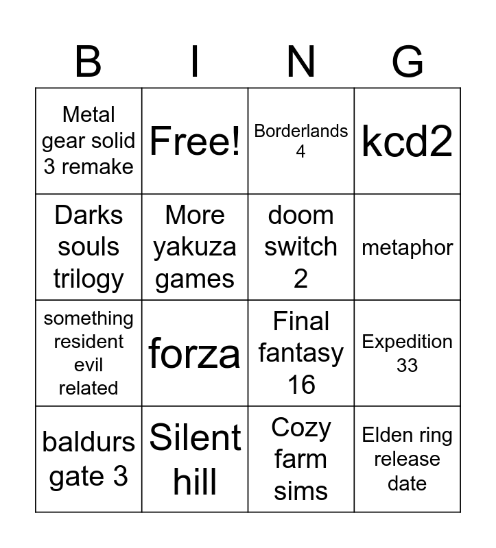 This bingo card has 19 words: Final fantasy 16, Dusk bloods, Borderlands 4, Elden ring release date, Expedition 33, Darks souls trilogy, Cozy farm sims, Metal gear solid 3 remake, Free!, something resident evil related, forza, More yakuza games, doom switch 2, Silent hill, baldurs gate 3, metaphor, kcd2, metaphor and nioh 3.