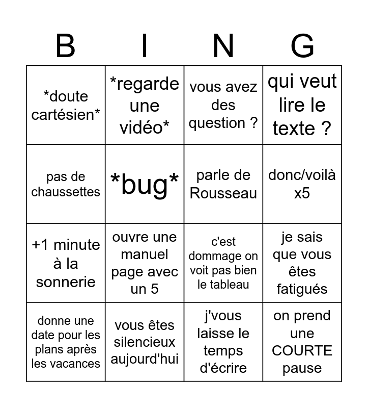 This bingo card has 16 words: vous êtes silencieux aujourd'hui, je sais que vous êtes fatigués, vous avez des question ?, *doute cartésien*, +1 minute à la sonnerie, *regarde une vidéo*, c'est dommage on voit pas bien le tableau, j'vous laisse le temps d'écrire, pas de chaussettes, *bug*, donne une date pour les plans après les vacances, qui veut lire le texte ?, ouvre une manuel page avec un 5, donc/voilà x5, parle de Rousseau and on prend une COURTE pause.