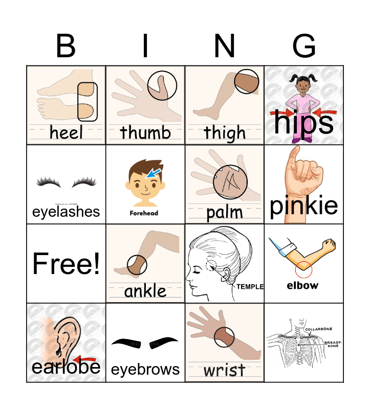 This bingo card has 19 images and 9 words: nostrils, earlobe, eyelashes, eyebrows, Free!, index finger, pinkie, hips and knuckles.