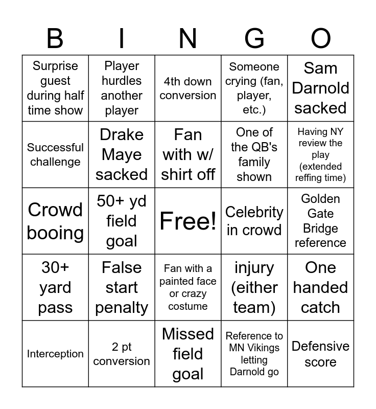 This bingo card has a free space and 29 words: Interception, Penalty Declined, 50+ yd field goal, Tush push touchdown, Surprise guest during half time show, 4th down conversion, Drake Maye sacked, False start penalty, Celebrity in crowd, 2 pt conversion, Golden Gate Bridge reference, Defensive score, Missed field goal, Reference to MN Vikings letting Darnold go, Having NY review the play (extended reffing time), Touchdown dance, Fan with a painted face or crazy costume, 30+ yard pass, Sam Darnold sacked, Crowd booing, injury (either team), Coach yelling, One of the QB's family shown, Successful challenge, Someone crying (fan, player, etc.), Player hurdles another player, One handed catch, Fan with w/ shirt off and Pick-6.
