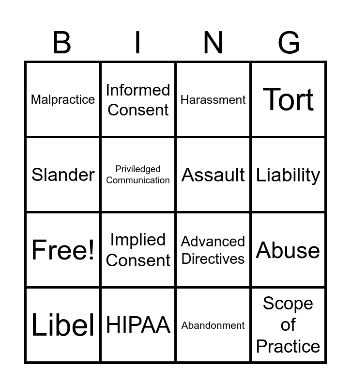 This bingo card has 20 words: Abuse, Negligence, Harassment, Invasion of Privacy, Libel, Slander, HIPAA, Malpractice, Free!, Informed Consent, Implied Consent, Advanced Directives, Priviledged Communication, Scope of Practice, Assault, Battery, Liability, Tort, Abandonment and Code of Ethics.