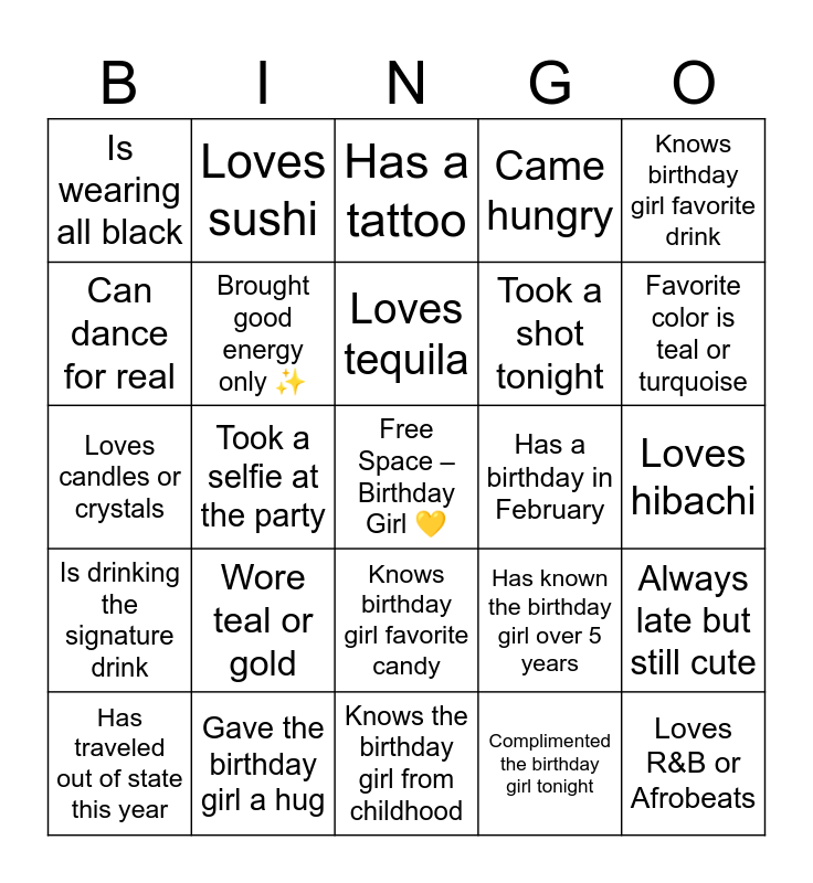 This bingo card has a free space and 25 words: Wore teal or gold, Knows the birthday girl from childhood, Loves tequila, Has traveled out of state this year, Knows birthday girl favorite drink, Is wearing all black, Can dance for real, Loves sushi, Has a birthday in February, Knows birthday girl favorite candy, Took a shot tonight, Loves candles or crystals, Has known the birthday girl over 5 years, Always late but still cute, Brought good energy only ✨, Is the life of the party, Loves hibachi, Has a tattoo, Favorite color is teal or turquoise, Took a selfie at the party, Loves R&B or Afrobeats, Gave the birthday girl a hug, Is drinking the signature drink, Came hungry and Complimented the birthday girl tonight.
