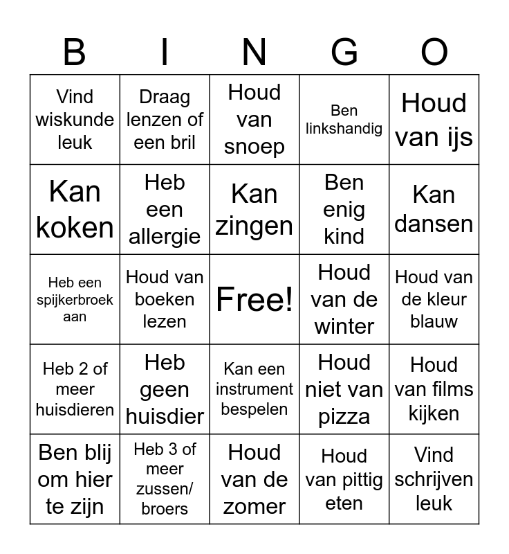 This bingo card has a free space and 24 words: Heb geen huisdier, Heb 3 of meer zussen/ broers, Kan zingen, Ben blij om hier te zijn, Houd van ijs, Vind wiskunde leuk, Kan koken, Draag lenzen of een bril, Houd van de winter, Kan een instrument bespelen, Ben enig kind, Heb een spijkerbroek aan, Houd niet van pizza, Houd van films kijken, Heb een allergie, Houd van pittig eten, Houd van de kleur blauw, Houd van snoep, Kan dansen, Houd van boeken lezen, Vind schrijven leuk, Heb 2 of meer huisdieren, Ben linkshandig and Houd van de zomer.