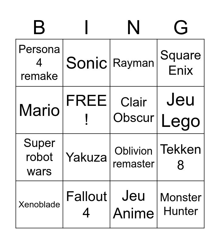This bingo card has 16 words: Fallout 4, Tekken 8, Rayman, Persona 4 remake, Super robot wars, Sonic, Oblivion remaster, Jeu Anime, Mario, FREE !, Xenoblade, Square Enix, Yakuza, Jeu Lego, Clair Obscur and Monster Hunter.