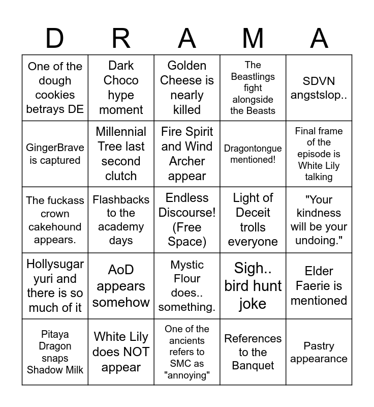 This bingo card has a free space and 24 words: AoD appears somehow, White Lily does NOT appear, Fire Spirit and Wind Archer appear, Pitaya Dragon snaps Shadow Milk, SDVN angstslop.., One of the dough cookies betrays DE, GingerBrave is captured, Dark Choco hype moment, Light of Deceit trolls everyone, Mystic Flour does.. something., Dragontongue mentioned!, The fuckass crown cakehound appears., Sigh.. bird hunt joke, Elder Faerie is mentioned, Millennial Tree last second clutch, References to the Banquet, "Your kindness will be your undoing.", Golden Cheese is nearly killed, Final frame of the episode is White Lily talking, Flashbacks to the academy days, Pastry appearance, Hollysugar yuri and there is so much of it, The Beastlings fight alongside the Beasts and One of the ancients refers to SMC as "annoying".