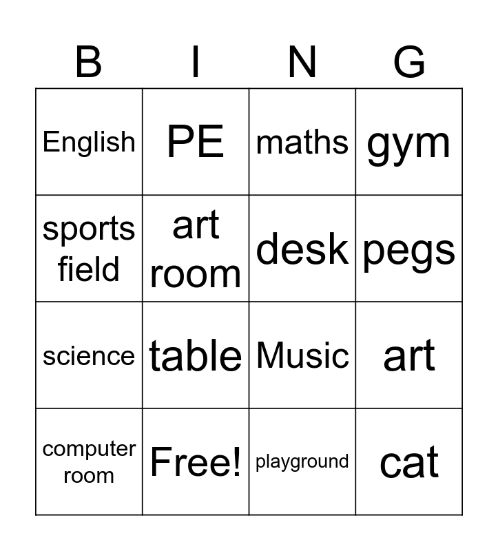 This bingo card has 16 words: Free!, art, maths, English, science, PE, Music, playground, sports field, art room, computer room, gym, table, pegs, desk and cat.