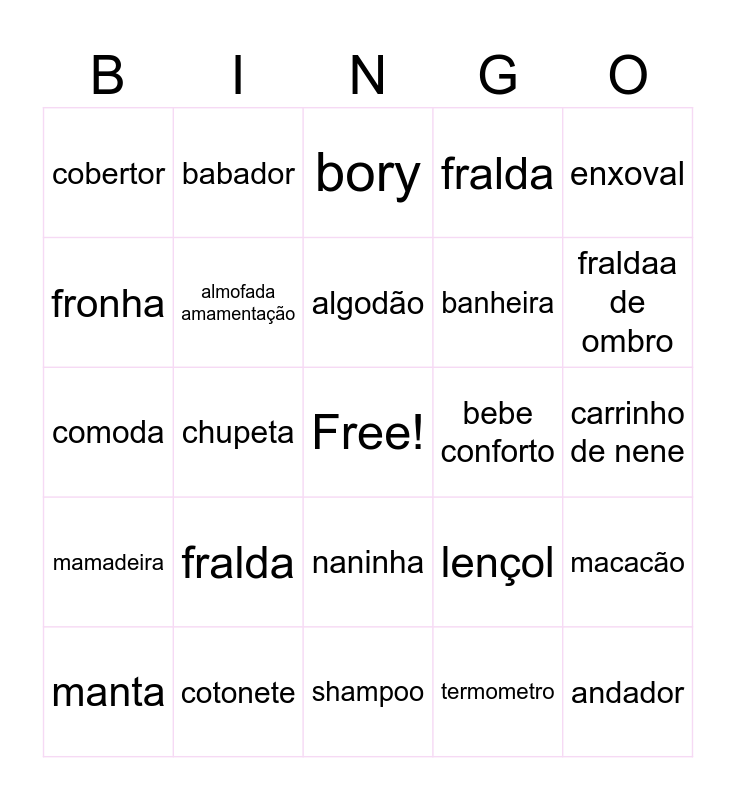 This bingo card has a free space and 41 words: berço, comoda, ninho, almofada amamentação, cotonete, naninha, algodão, cueiro, enxoval, mamadeira, chupeta, fralda, andador, carrinho de nene, bebe conforto, fralda, paninho de boca, cobertor, mijão, bory, macacão, prendedor de chupeta, shampoo, banheira, clmcolic, pomada de assadura, termometro, lenço humidecido, fraldaa de ombro, pre natal, ultrassom, babador, manta, traveseiro, lençol, fronha, andador, escova de cabelo, pente, cortador de unhas and aspirador nasal.